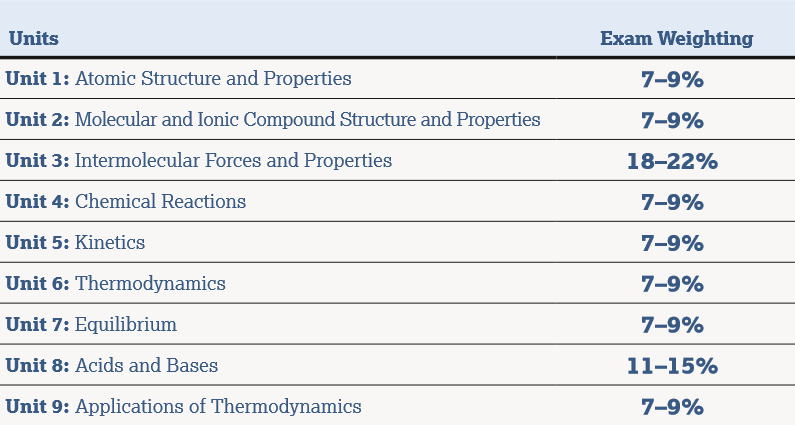 单选题形式四选一,不能使用计算器,因此计算量都不大,主要考察学生对于化学概念、原理掌握熟练程度;从实际考试来看,时间会比较紧,而且AP化学选择题的阅读量比较大,因此需要提高阅读速度。 简答题的前面三题综合性比较强,分值较高;后面四题相对简单,全部可以使用计算器。AP化学对于计算器要求不高,一般科学计算器就够用了;图形计算器也可以使用。 四、考试内容 下图是College Board官网公布的2019-2020最新的考试内容以及其所占比重: